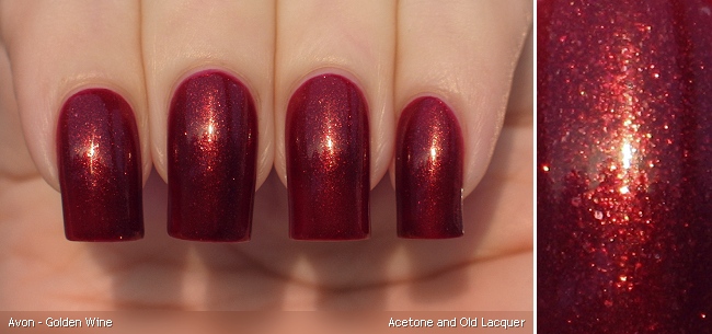 First of all - I looove the Avon brush, it's wide and flat and stiff enough to allow precise application of polish. Speaking of the polish, Golden Wine reminds me of lingonberry jam, yum! It's a burgundy-ish red shimmer packed with larger flecks of gold, it's very Christmasy in a distinguished way. The formula was watery and somewhat runny but also quite pigmented, this is two coats. You can see a tiny bit of VNL and general streakiness in the last picture and it could honestly have used a third coat. Formula issues aside, I'd seriously recommend every red lover to get this polish.